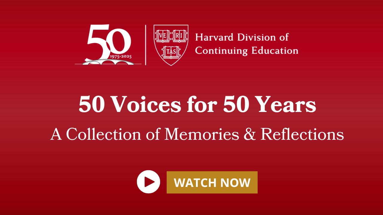 Welcome to 50 Voices for 50 Years, a living mosaic of the Harvard Division of Continuing Education community. Over the past half-century, DCE has opened doors, sparked breakthroughs, and empowered learners around the globe. Hear from alumni, faculty, staff, and students as they reflect on what DCE’s mission of access, innovation, and impact means to them — and to the future of lifelong learning.